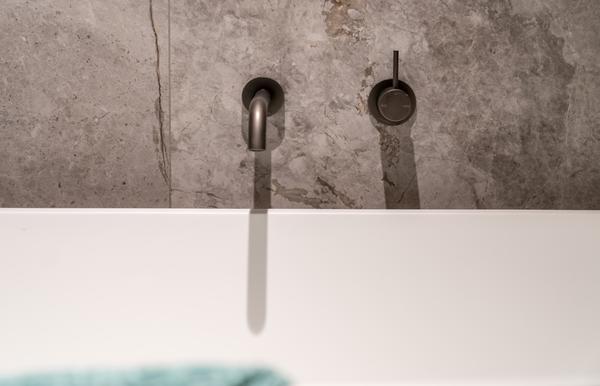 Solid surface bathtub to master ensuite in selected residences with Phoenix gunmetal finish sprout on the natural marble